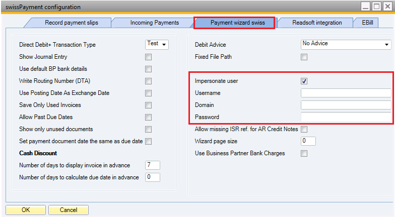 The idea behind this improvement is, that there is only a specific trusted user who can access and work with payment files. This user is configured in Windows (as any other user) and has permission to access and write to a specific folder where other users do not have permission. This user is then entered also in the SwissPayment configuration.