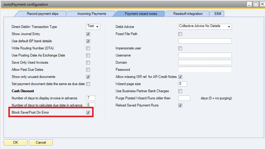 The functionality can be activated by ticking a check-box "Block Save/Post On Error" on the Payment wizard swiss tab in the swissPayment configuration.