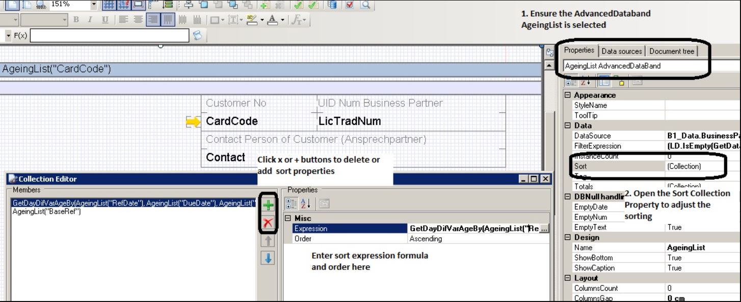 GetDayDifVarAgeBy(AgeingList("RefDate"), AgeingList("DueDate"), AgeingList("TaxDate"),AgeingList("Transtype")) - Enter the BaseRef to sort by document number. Make sure to use the AgeingList AdvancedDataBand to get the data. Here is the formula to enter: