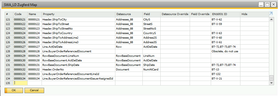 - Enhancement of UDT SWA_LD_ZUGFERDMAP and SWA_LD_ZUGFERDMAP90 to include the "Hide" column (see V.1. Mapping - User-Defined Fields) - Enhancement of the NumAtCard logic (see VI.1.BT-10 & BT-13 - NumAtCard - Buyer Reference/Leitweg ID and Purchase Order Reference) - Implementation of BuyerOrderReferencedDocument logic (see VI.2.BT-132 / BT-X-21 - BuyerOrderReferencedDocument) - Enhancement of Bill To/Ship To address determination logic (see VI.3.Determination of Bill To/Ship To Addresses) - Adding configuration table SWA_LD_ZUGFERDSET to control specific behavior XML file generation (see V.4. Configuration - Various Settings) - Implementation of IBAN Determination logic (see VI.4. BT-84 - IBAN Determination) - Determination of the DeliveryDate - BT-72 - Determination of the Service Delivery Date - BT-73 |