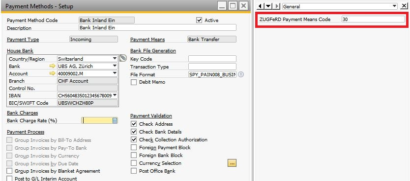 Starting with Coresuite 8.50, a new UDF “ZUGFeRD Payment Means Code” has been added to the Payment Means form. This field allows users to specify a value according to the official list of payment means codes defined in the UNCL4461 code list: https://docs.peppol.eu/poacc/billing/3.0/codelist/UNCL4461/