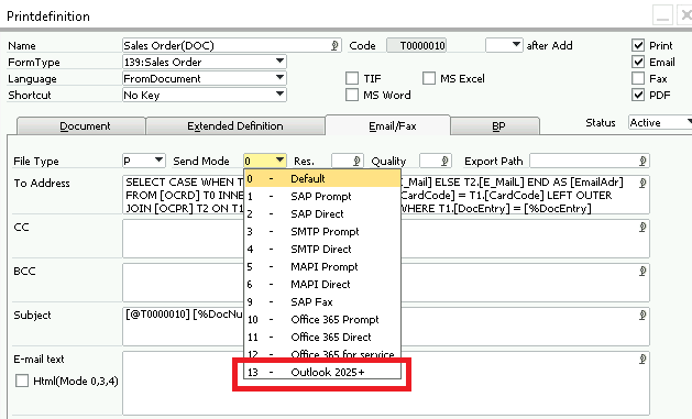 At present, there is a limitation. The new Outlook versions can only be used in the “prompt” mode. When Send Mode 13 is selected and the email icon is clicked in SAP Business One, the Outlook application opens each time to prompt the user. A direct sending mode is not supported at this time by Microsoft.
