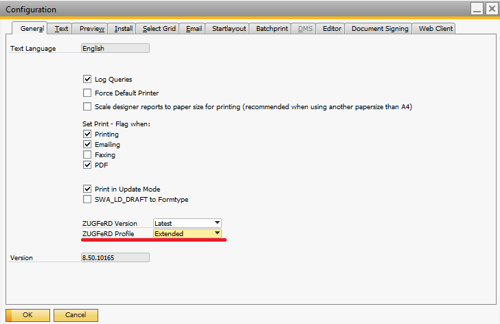 A new configuration setting for the ZUGFeRD profile has been introduced at company level in the Designer configuration. In addition, a corresponding business partner UDF is available to allow selection of a specific profile per business partner.